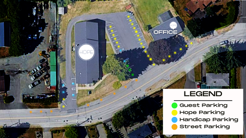 The main parking lot is on the east side of the church. There are handicap spaces near the upper-level front doors, as well as the lower doors. (Reference the map below.)